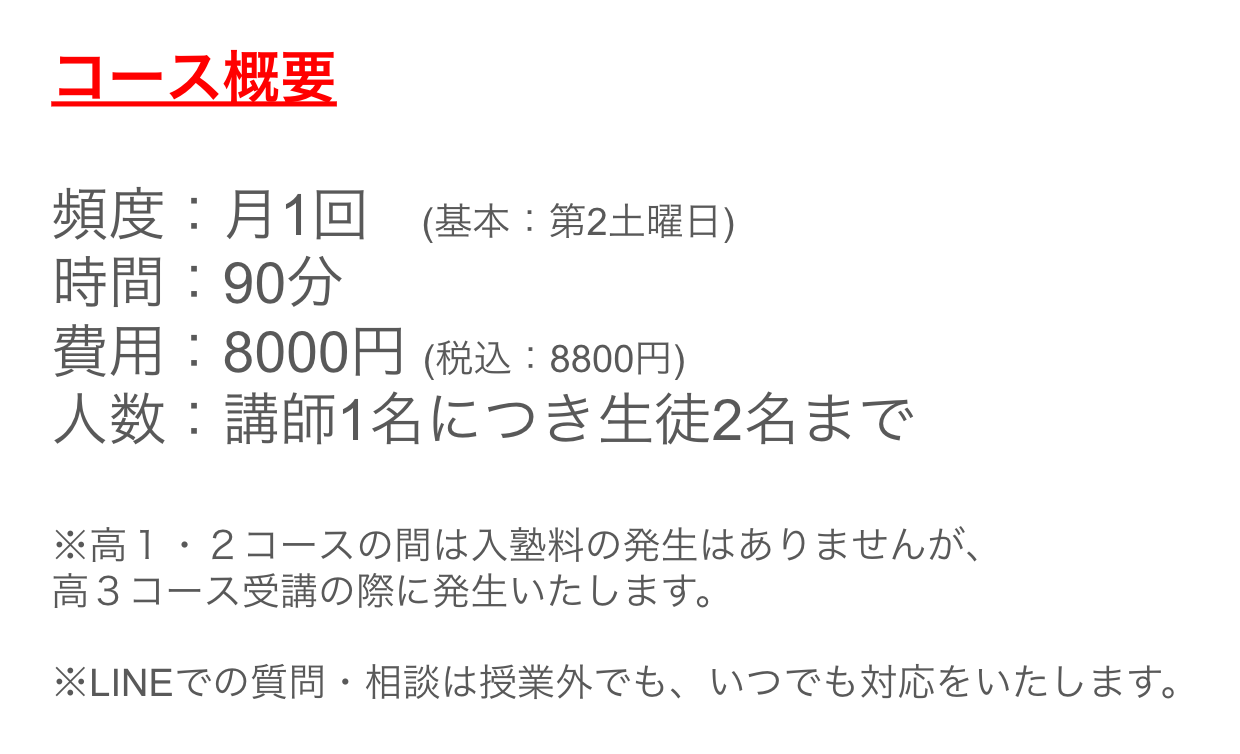 1回のみの受講も可能なため、総合型選抜以外の受験の可能性がある方や、まずは試しに受講をして見たい方、他の塾と検討をしている方などにも、まずは受講いただけたらと思います。